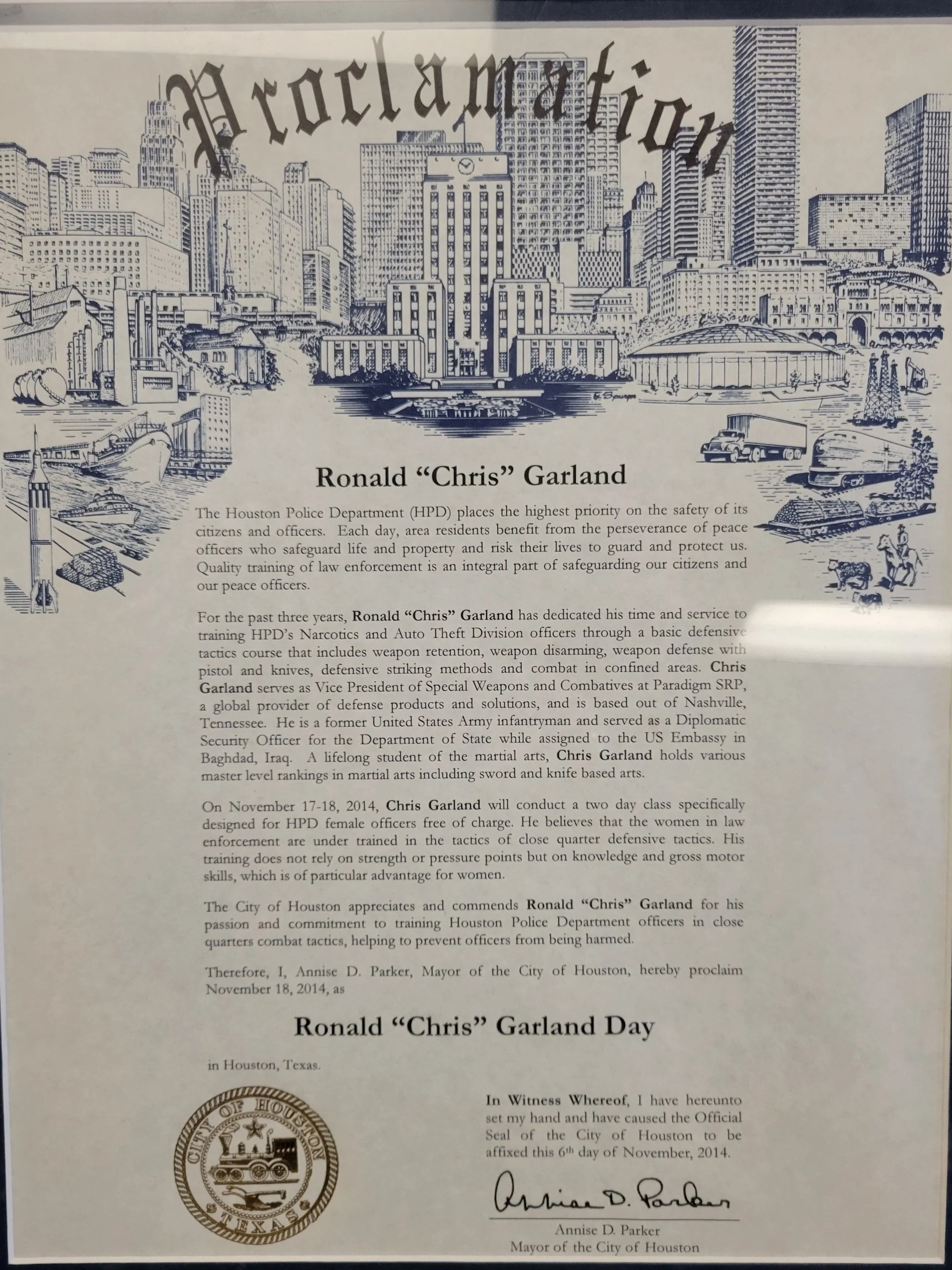 In November 2014, Houston Mayor Annise D. Parker issued an official proclamation declaring November 18th as "Ronald 'Chris' Garland Day." The honor recognized Chris Garland's exceptional service training Houston Police Department officers in advanced defensive tactics.